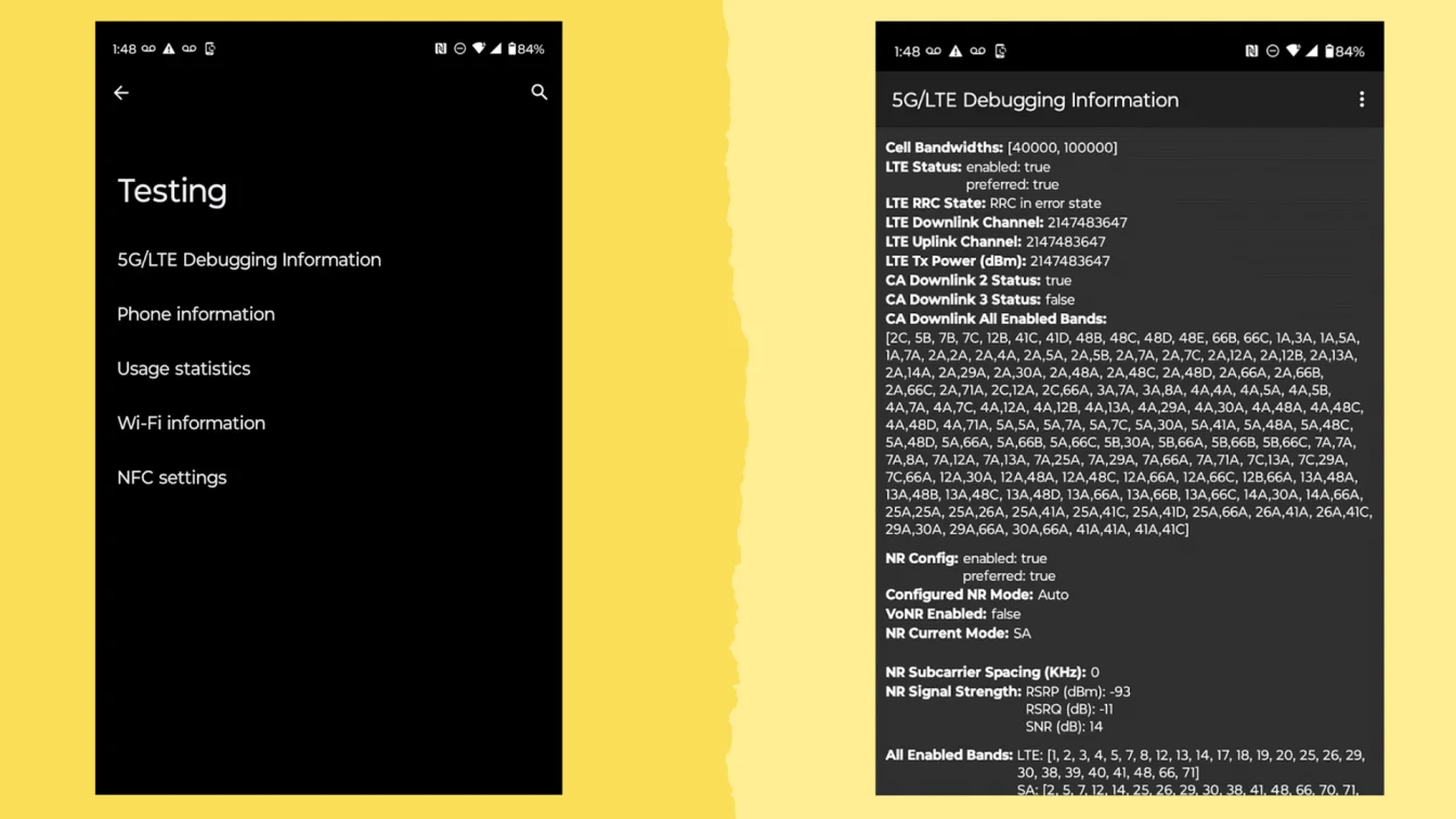يعرض هذا الكود (لأجهزة أندرويد فقط) لوحة إعدادات اختبار تحتوي على معلومات حول تصحيح أخطاء 5G/LTE، معلومات الهاتف، إحصاءات الاستخدام، ومعلومات Wi-Fi.