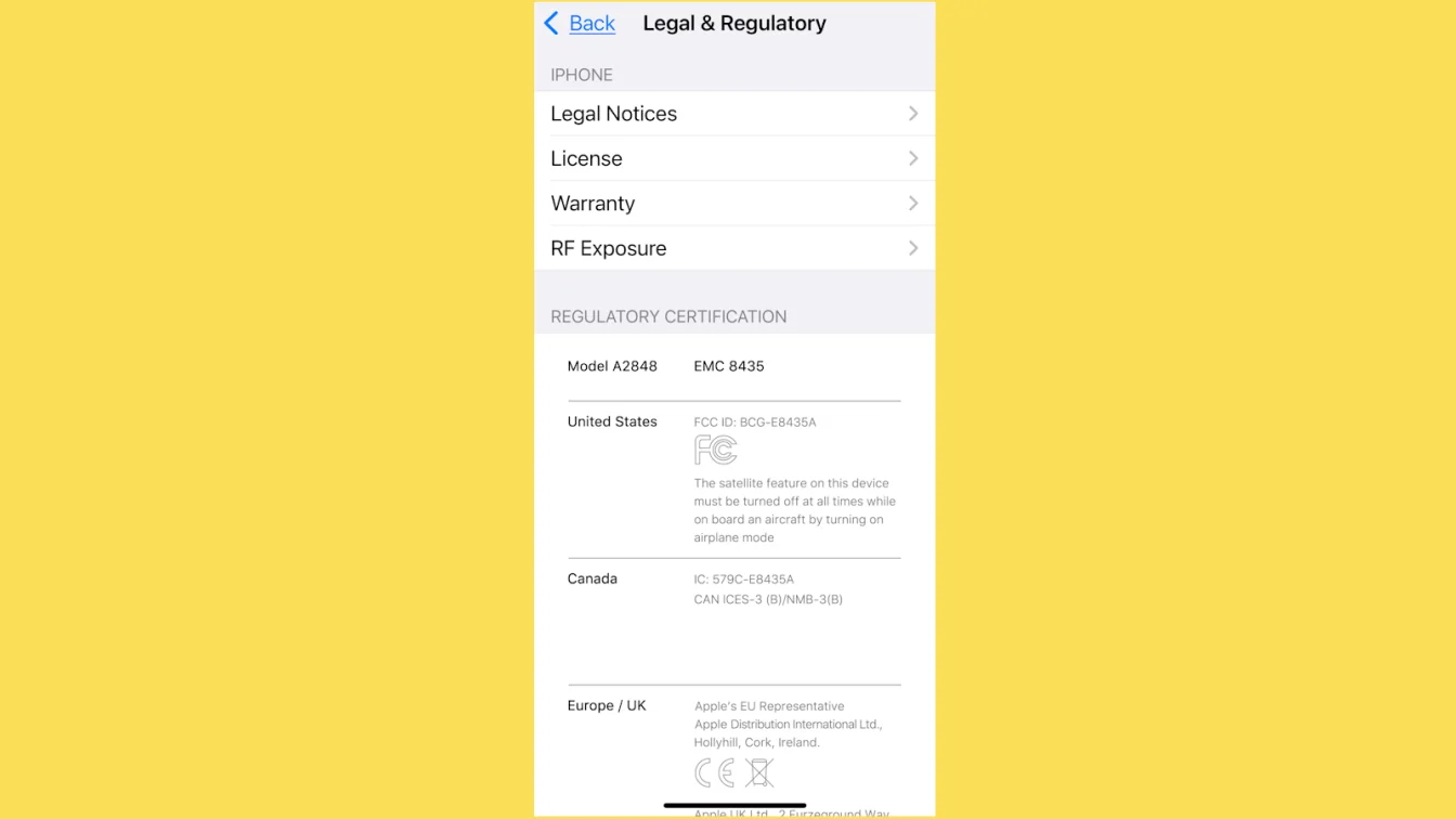 ينقلك هذا الكود مباشرة إلى المعلومات القانونية والتنظيمية المتعلقة بطراز هاتفك، بما في ذلك معلومات الضمان وتحذيرات التعرض للترددات اللاسلكية.