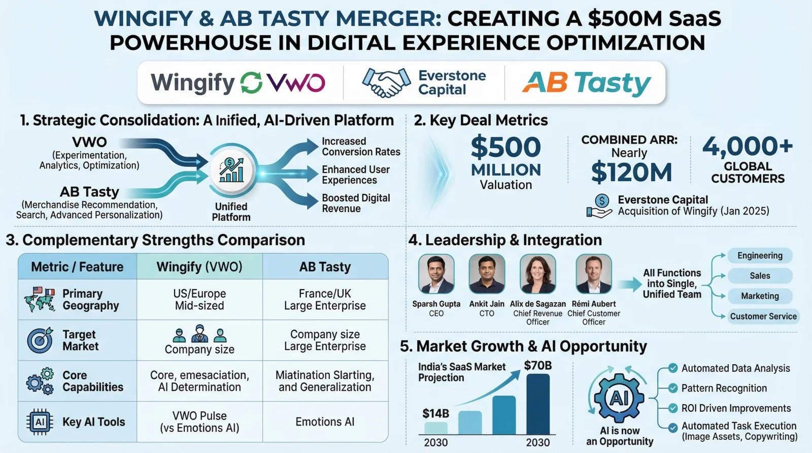 بدعم من شركة Everstone، نفذت شركة Wingify أول عملية استحواذ في تاريخها في شهر ديسمبر 2025، حيث اشترت منصة أبحاث المستخدمين المدعومة بالذكاء الاصطناعي Blitzllama في صفقة نقدية بالكامل. تم دمج هذه التكنولوجيا بسرعة، مما أدى إلى إطلاق أداة VWO Pulse في شهر فبراير 2026. يمثل الاندماج اللاحق مع شركة AB Tasty مسعى أكبر بكثير، ويتطلب مواءمة دقيقة لعمليتين عالميتين متميزتين.