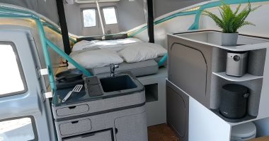 هناك أيضًا مساحة لسرير مزدوج وطاولة طعام ومنطقة جلوس ومغسلة بجوار الموقد، بالإضافة إلى مقعد لراكبين في المقدمة، بما في ذلك السائق.