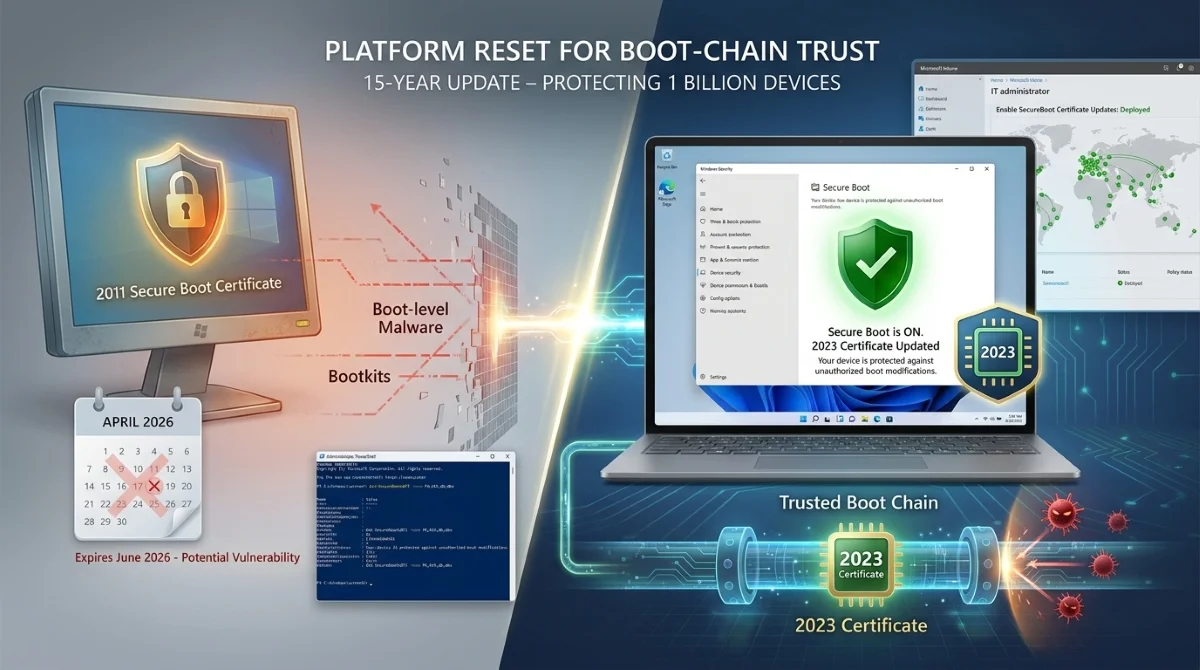 تستبدل شركة مايكروسوفت شهادات Secure Boot من عام 2011 في معظم أجهزة ويندوز، وهي تغيير بعد 15 عاماً يحمي من البرمجيات الضارة على مستوى الإقلاع مثل bootkits. يتم طرح التحديث عبر تصحيح أمان أبريل، ويؤثر على مليار جهاز، مع انتهاء صلاحية الشهادات في يونيو 2026.