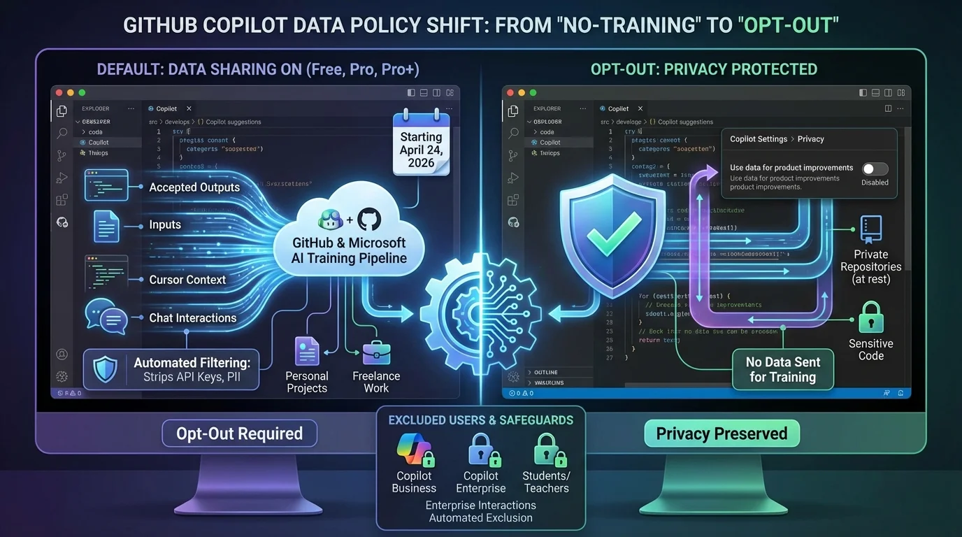 GitHub is fundamentally changing how it handles developer data, announcing that starting April 24, 2026, it will use interaction data from Copilot Free, Pro, and Pro+ users to train its AI models. This approach aligns with established industry practices, but it shifts the platform from a strict no-training stance to an opt-out model for individual developers. Copilot Business and Copilot Enterprise users remain completely exempt from this update.
