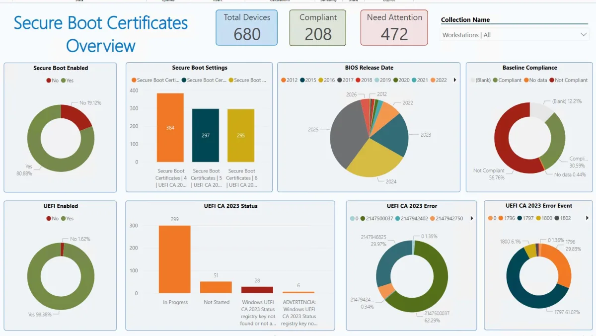 Managing the upcoming 2026 Secure Boot certificate expirations across a large fleet of devices can quickly become an administrative nightmare. To help IT administrators track compliance and identify devices struggling to update, a new Secure Boot Certificates Power BI Dashboard integrates directly with Microsoft Configuration Manager. Whether you are running Configuration Manager in standalone mode or utilizing CoManaged devices, this dashboard provides critical visibility into your infrastructure's Secure Boot status.
