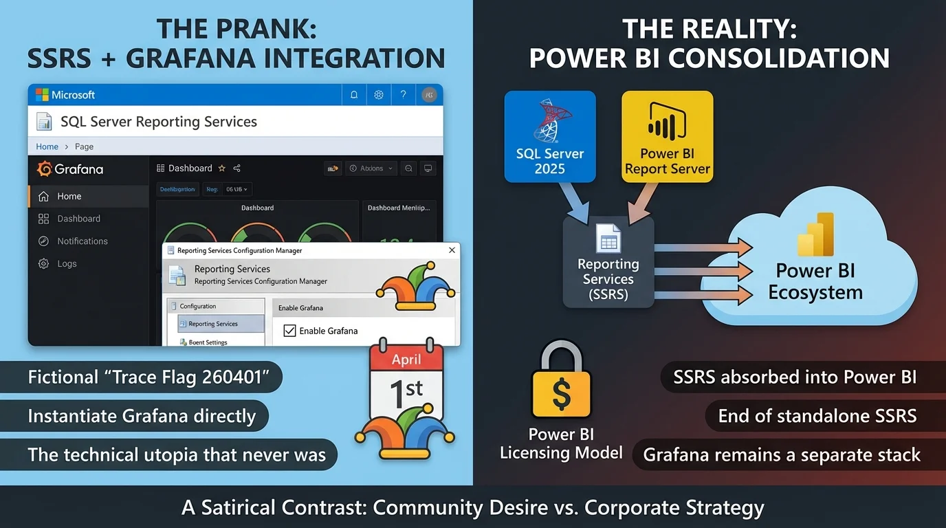 The highly anticipated native Grafana SSRS integration for SQL Server Reporting Services is officially nothing more than an elaborate April Fools' joke. Published by Steve Jones at SQLServerCentral, the satirical guide claimed that users could natively embed Grafana dashboards inside SSRS using a hidden trace flag. The fictional pilot program supposedly originated in SQL Server 2022, designed to instantiate a Grafana instance directly from an SSRS server and extend the user interface to read standard SSRS RDL files.