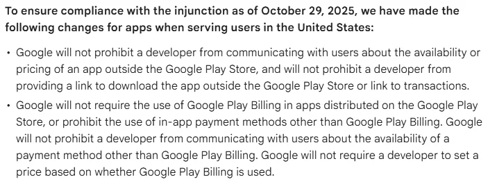 قامت جوجل بتحديث صفحات الدعم الخاصة بها لتأكيد امتثالها لأمر المحكمة. ففي الولايات المتحدة، أصبح لدى مطوري متجر Play الآن خيار استخدام منصات دفع خارجية تتجاوز متجر Play تمامًا.
